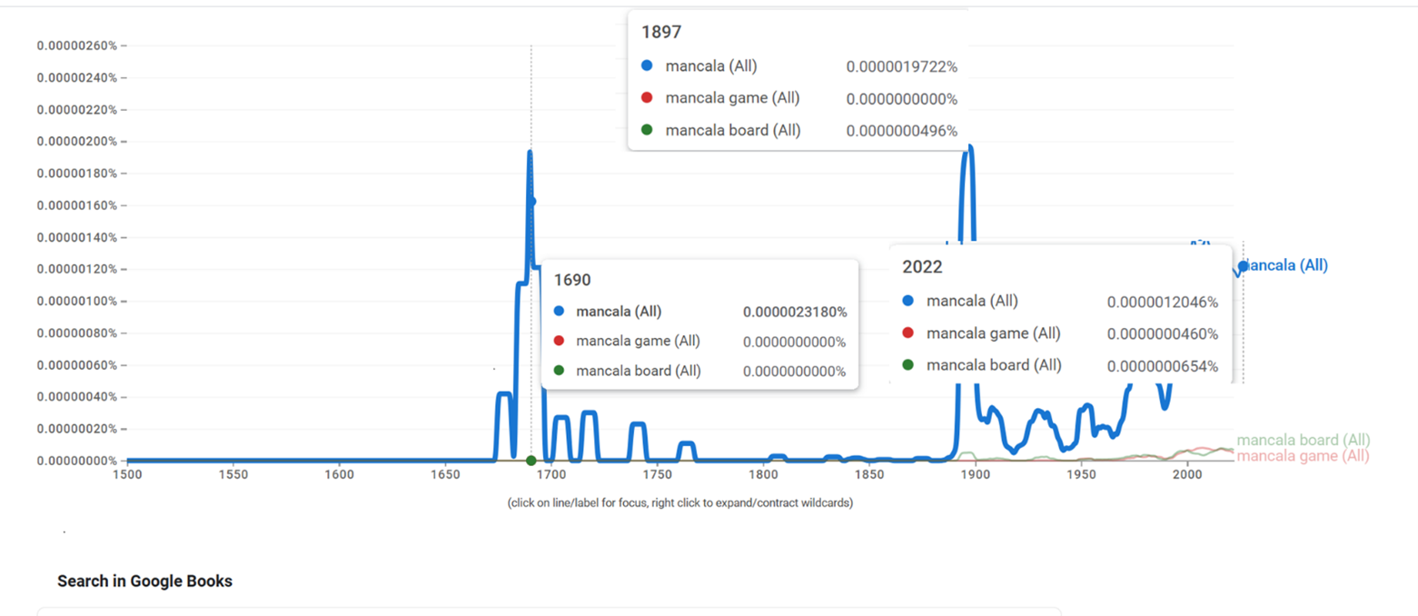We first examined the historical use of these terms within Google Books database with Ngram, and within JSTOR journal database supported by Constellate, using DfR. We searched for the following words in Ngram and DfR: “mancala,” “mancala game,” “mancala board,” and “mancala African game.” The Ngram results (Figure 1) of the textual analysis ranged from 1500–2022 and indicate that the term “mancala” has been employed by researchers since 1675. This date corresponds to the 17th Century in which Western empires were increasingly establishing colonies in Africa and in other parts of the world.26 Embedded in the project of colonization is the idea that the colonized are irrational, idle, and backward people; it is an individual who needs to “break free from his customary ways of thinking, being, and worshipping to adopt European arts, sciences, and knowledge.”27 We see an increase usage in the 1690s and then in 1897. Figure 1 also shows a slight increase in the years 2000s and 2022, after a decrease in the 1980s. The book by Jean De Thévenot, titled The Travels of Monsieur De Thevenot into the Levant: In Three Parts,28 is one of the earliest references to the use of “mancala” in Google Books database. In the 1900s, John H. Weeks, with his book titled Among Congo Cannibals,29 also employs mancala to describe a game played by the people of Congo. The results further show that the utilization of “mancala” as the name for classic African board games spreads across three centuries (Figure 1). For instance, books that contain the word “mancala” from 2019- 2022 include: Culin, Mancala, the National Game of Africa;30 Daniels, Make Your Own Board Game;31 Huylebrouck, Africa and Mathematics;32Ian Livingstone and James Wallis, Board Games in 100 Moves (New York: Penguin, 2019).[/ref]